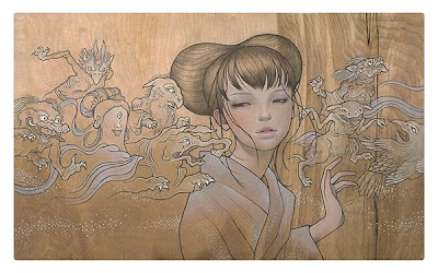 Now showing at the Jonathan LeVine Gallery in New York are new works by Audrey Kawasaki. Her highly anticipated solo exhibition started with an opening reception this past Saturday, December 12th. The new series called, Hajimari, is just as beautiful and gorgeous as one would expect. Toeing the line between innocent and erotic, Audrey's paintings always keep us guessing.As the gallery states, "Contradiction is a concept that also plays an important role in Audrey’s provocative subject matter. The paradox of identity in the perception and allure of the unknown is what lies behind the direct gaze of her subjects—who remain a constant mystery, even to Audrey. Other issues include: coming of age, social pressure, inner-conflict, innocence, sexual maturity, idealizing, idolizing, femininity and desire."